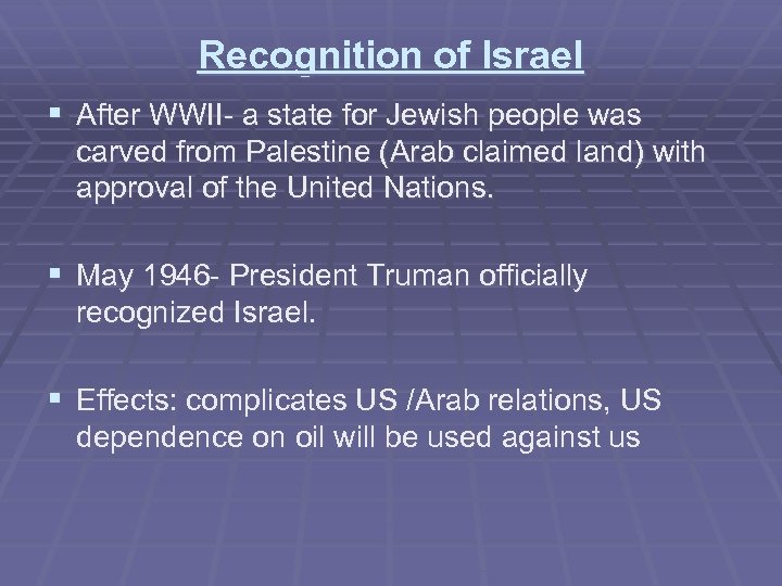 Recognition of Israel § After WWII- a state for Jewish people was carved from Palestine (Arab claimed land) with approval of the United Nations. § May 1946 - President Truman officially recognized Israel. § Effects: complicates US /Arab relations, US dependence on oil will be used against us