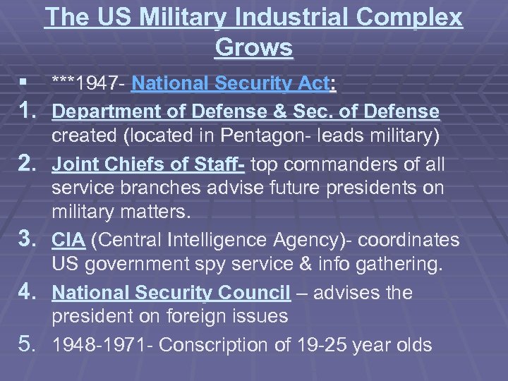 The US Military Industrial Complex Grows § 1. 2. 3. 4. 5. ***1947 - National Security Act: Department of Defense & Sec. of Defense created (located in Pentagon- leads military) Joint Chiefs of Staff- top commanders of all service branches advise future presidents on military matters. CIA (Central Intelligence Agency)- coordinates US government spy service & info gathering. National Security Council – advises the president on foreign issues 1948 -1971 - Conscription of 19 -25 year olds