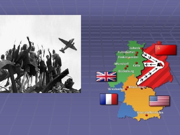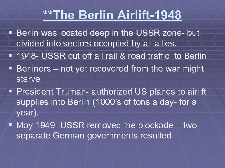 **The Berlin Airlift-1948 § Berlin was located deep in the USSR zone- but § § divided into sectors occupied by allies. 1948 - USSR cut off all rail & road traffic to Berliners – not yet recovered from the war might starve President Truman- authorized US planes to airlift supplies into Berlin (1000’s of tons a day- for a year). May 1949 - USSR removed the blockade – two separate German governments resulted