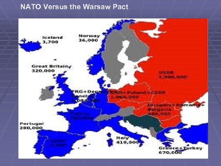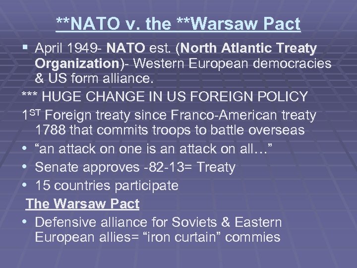 **NATO v. the **Warsaw Pact § April 1949 - NATO est. (North Atlantic Treaty Organization)- Western European democracies & US form alliance. *** HUGE CHANGE IN US FOREIGN POLICY 1 ST Foreign treaty since Franco-American treaty 1788 that commits troops to battle overseas • “an attack on one is an attack on all…” • Senate approves -82 -13= Treaty • 15 countries participate The Warsaw Pact • Defensive alliance for Soviets & Eastern European allies= “iron curtain” commies