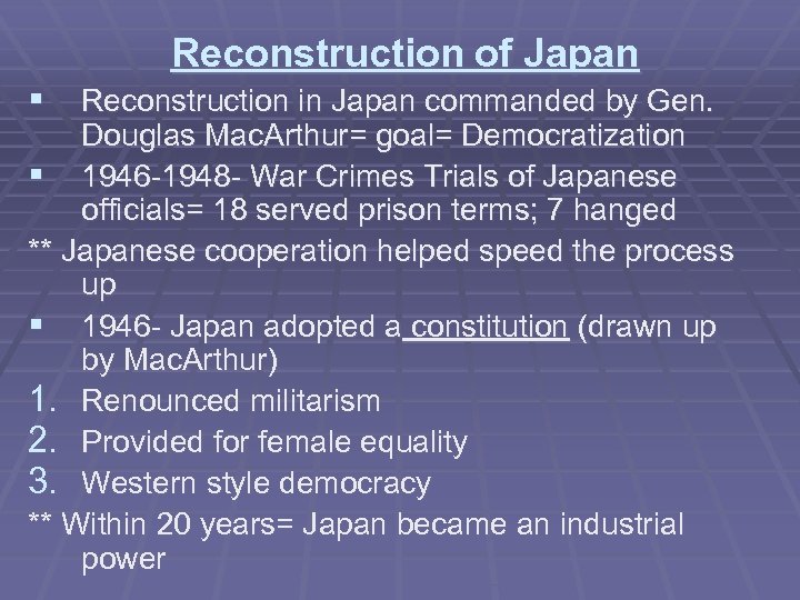 Reconstruction of Japan § Reconstruction in Japan commanded by Gen. Douglas Mac. Arthur= goal= Democratization § 1946 -1948 - War Crimes Trials of Japanese officials= 18 served prison terms; 7 hanged ** Japanese cooperation helped speed the process up § 1946 - Japan adopted a constitution (drawn up by Mac. Arthur) 1. Renounced militarism 2. Provided for female equality 3. Western style democracy ** Within 20 years= Japan became an industrial power