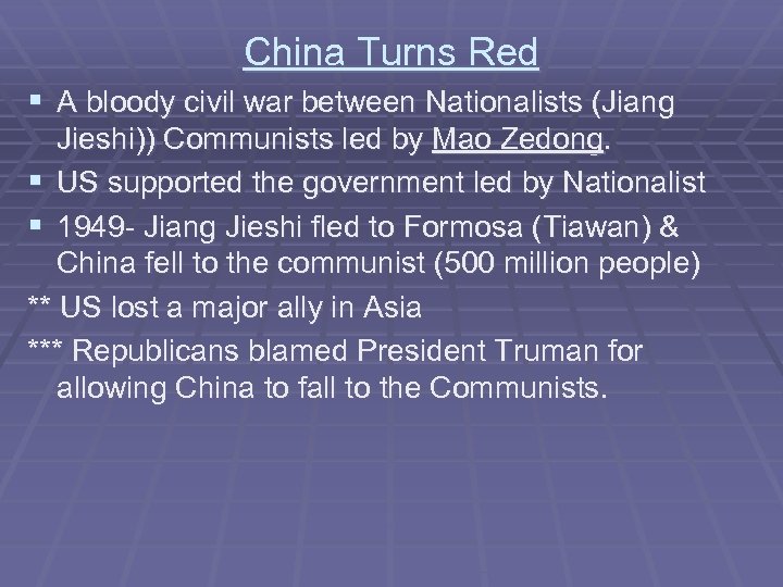 China Turns Red § A bloody civil war between Nationalists (Jiang Jieshi)) Communists led by Mao Zedong. § US supported the government led by Nationalist § 1949 - Jiang Jieshi fled to Formosa (Tiawan) & China fell to the communist (500 million people) ** US lost a major ally in Asia *** Republicans blamed President Truman for allowing China to fall to the Communists.