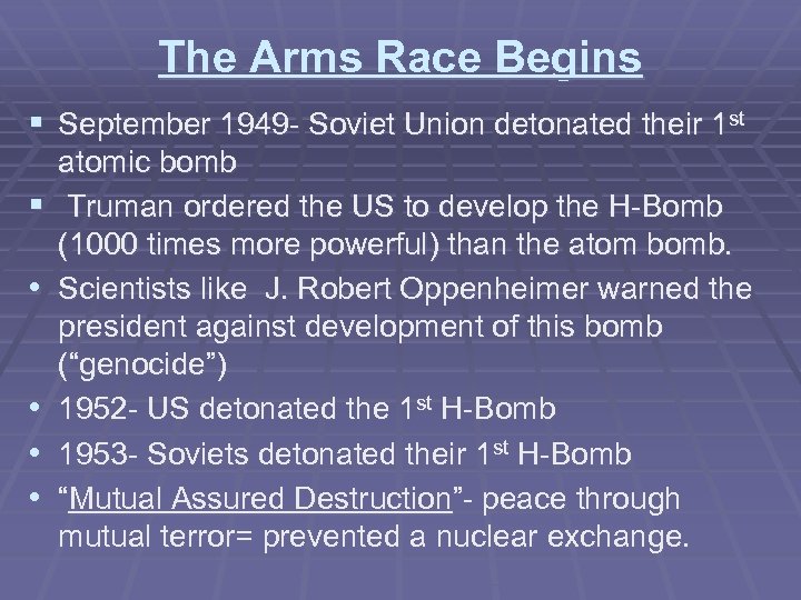 The Arms Race Begins § September 1949 - Soviet Union detonated their 1 st § • • atomic bomb Truman ordered the US to develop the H-Bomb (1000 times more powerful) than the atom bomb. Scientists like J. Robert Oppenheimer warned the president against development of this bomb (“genocide”) 1952 - US detonated the 1 st H-Bomb 1953 - Soviets detonated their 1 st H-Bomb “Mutual Assured Destruction”- peace through mutual terror= prevented a nuclear exchange.