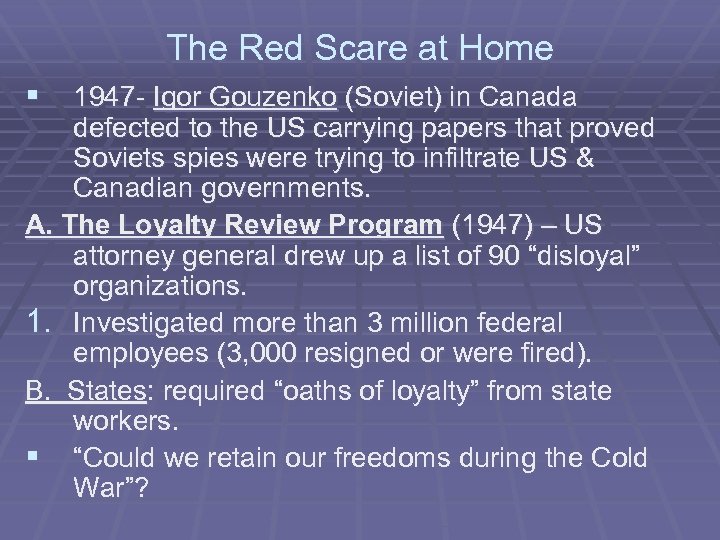 The Red Scare at Home § 1947 - Igor Gouzenko (Soviet) in Canada defected to the US carrying papers that proved Soviets spies were trying to infiltrate US & Canadian governments. A. The Loyalty Review Program (1947) – US attorney general drew up a list of 90 “disloyal” organizations. 1. Investigated more than 3 million federal employees (3, 000 resigned or were fired). B. States: required “oaths of loyalty” from state workers. § “Could we retain our freedoms during the Cold War”?