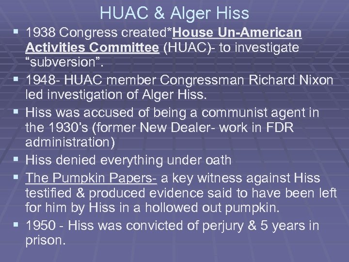 HUAC & Alger Hiss § 1938 Congress created*House Un-American § § § Activities Committee (HUAC)- to investigate “subversion”. 1948 - HUAC member Congressman Richard Nixon led investigation of Alger Hiss was accused of being a communist agent in the 1930’s (former New Dealer- work in FDR administration) Hiss denied everything under oath The Pumpkin Papers- a key witness against Hiss testified & produced evidence said to have been left for him by Hiss in a hollowed out pumpkin. 1950 - Hiss was convicted of perjury & 5 years in prison.