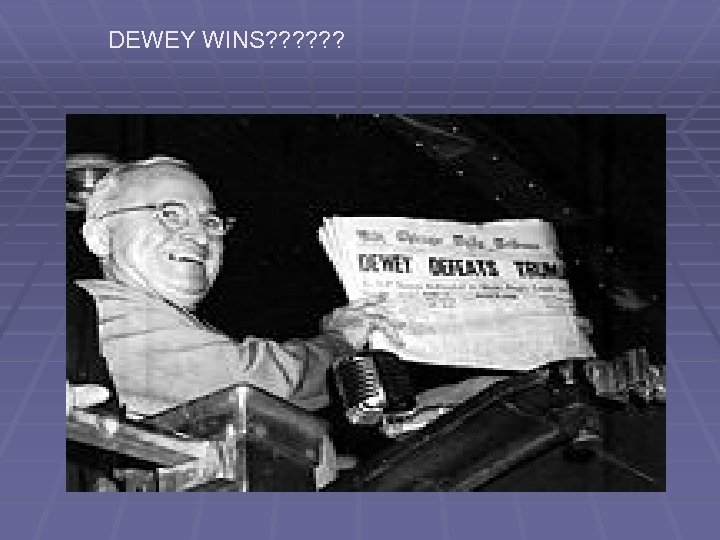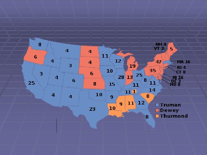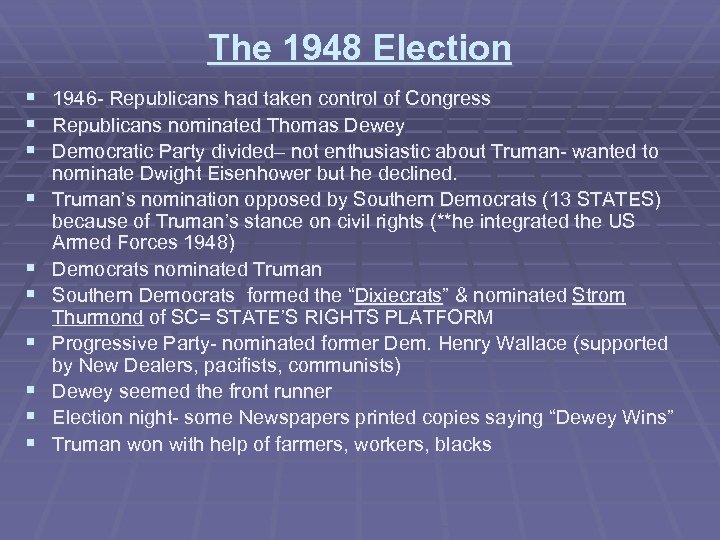 The 1948 Election § § § § § 1946 - Republicans had taken control of Congress Republicans nominated Thomas Dewey Democratic Party divided– not enthusiastic about Truman- wanted to nominate Dwight Eisenhower but he declined. Truman’s nomination opposed by Southern Democrats (13 STATES) because of Truman’s stance on civil rights (**he integrated the US Armed Forces 1948) Democrats nominated Truman Southern Democrats formed the “Dixiecrats” & nominated Strom Thurmond of SC= STATE’S RIGHTS PLATFORM Progressive Party- nominated former Dem. Henry Wallace (supported by New Dealers, pacifists, communists) Dewey seemed the front runner Election night- some Newspapers printed copies saying “Dewey Wins” Truman won with help of farmers, workers, blacks