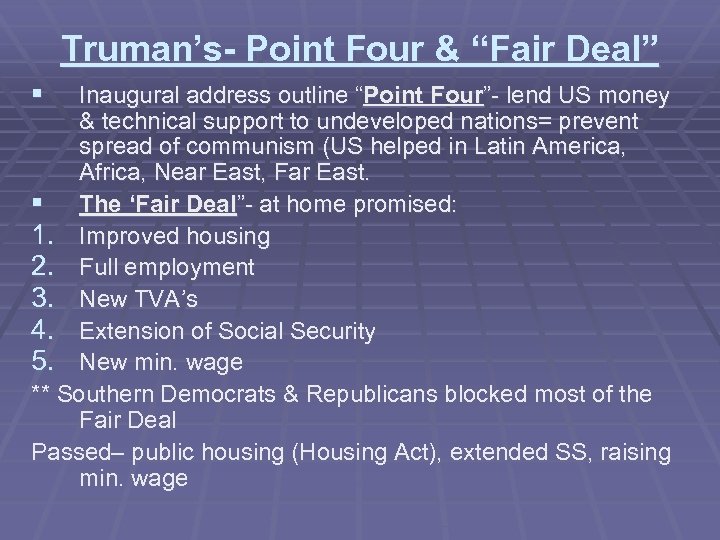 Truman’s- Point Four & “Fair Deal” § Inaugural address outline “Point Four”- lend US money & technical support to undeveloped nations= prevent spread of communism (US helped in Latin America, Africa, Near East, Far East. § The ‘Fair Deal”- at home promised: 1. Improved housing 2. Full employment 3. New TVA’s 4. Extension of Social Security 5. New min. wage ** Southern Democrats & Republicans blocked most of the Fair Deal Passed– public housing (Housing Act), extended SS, raising min. wage