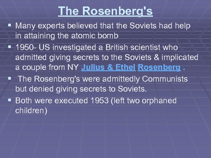 The Rosenberg's § Many experts believed that the Soviets had help § § § in attaining the atomic bomb 1950 - US investigated a British scientist who admitted giving secrets to the Soviets & implicated a couple from NY Julius & Ethel Rosenberg. The Rosenberg's were admittedly Communists but denied giving secrets to Soviets. Both were executed 1953 (left two orphaned children)