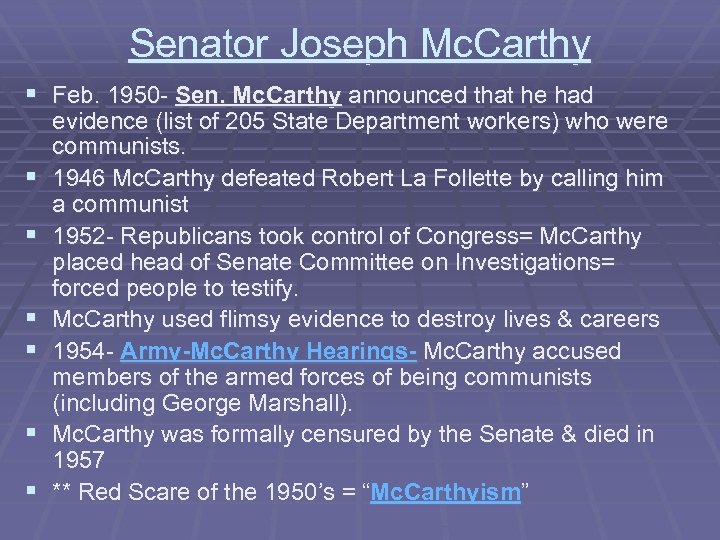Senator Joseph Mc. Carthy § Feb. 1950 - Sen. Mc. Carthy announced that he had § § § evidence (list of 205 State Department workers) who were communists. 1946 Mc. Carthy defeated Robert La Follette by calling him a communist 1952 - Republicans took control of Congress= Mc. Carthy placed head of Senate Committee on Investigations= forced people to testify. Mc. Carthy used flimsy evidence to destroy lives & careers 1954 - Army-Mc. Carthy Hearings- Mc. Carthy accused members of the armed forces of being communists (including George Marshall). Mc. Carthy was formally censured by the Senate & died in 1957 ** Red Scare of the 1950’s = “Mc. Carthyism”