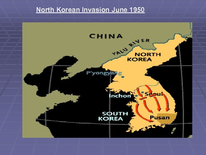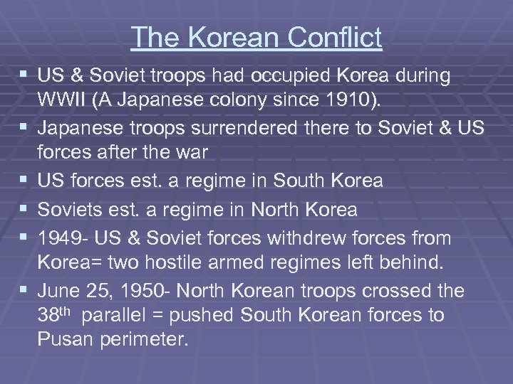 The Korean Conflict § US & Soviet troops had occupied Korea during § § § WWII (A Japanese colony since 1910). Japanese troops surrendered there to Soviet & US forces after the war US forces est. a regime in South Korea Soviets est. a regime in North Korea 1949 - US & Soviet forces withdrew forces from Korea= two hostile armed regimes left behind. June 25, 1950 - North Korean troops crossed the 38 th parallel = pushed South Korean forces to Pusan perimeter.