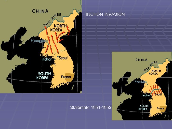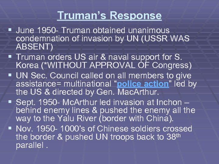 Truman’s Response § June 1950 - Truman obtained unanimous § § condemnation of invasion by UN (USSR WAS ABSENT) Truman orders US air & naval support for S. Korea (*WITHOUT APPROVAL OF Congress) UN Sec. Council called on all members to give assistance= multinational “police action” led by the US & directed by Gen. Mac. Arthur. Sept. 1950 - Mc. Arthur led invasion at Inchon – behind enemy lines & pushed the enemy all the way to the Yalu River (border with China). Nov. 1950 - 1000’s of Chinese soldiers crossed the border & pushed UN troops back to 38 th parallel.