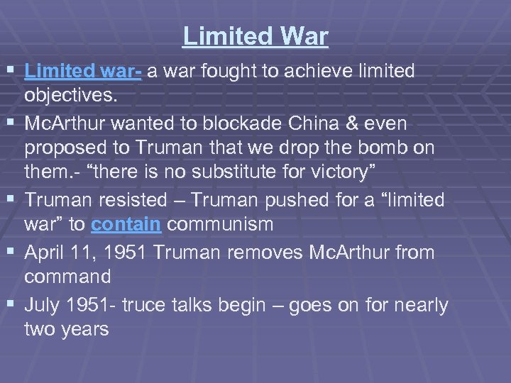 Limited War § Limited war- a war fought to achieve limited § § objectives. Mc. Arthur wanted to blockade China & even proposed to Truman that we drop the bomb on them. - “there is no substitute for victory” Truman resisted – Truman pushed for a “limited war” to contain communism April 11, 1951 Truman removes Mc. Arthur from command July 1951 - truce talks begin – goes on for nearly two years