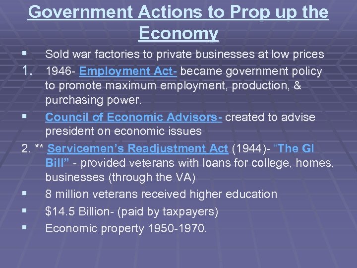 Government Actions to Prop up the Economy § Sold war factories to private businesses at low prices 1. 1946 - Employment Act- became government policy to promote maximum employment, production, & purchasing power. § Council of Economic Advisors- created to advise president on economic issues 2. ** Servicemen’s Readjustment Act (1944)- “The GI Bill” - provided veterans with loans for college, homes, businesses (through the VA) § 8 million veterans received higher education § $14. 5 Billion- (paid by taxpayers) § Economic property 1950 -1970.