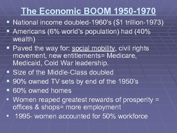 The Economic BOOM 1950 -1970 § National income doubled-1960’s ($1 trillion-1973) § Americans (6% world’s population) had (40% § § • • wealth) Paved the way for: social mobility, civil rights movement, new entitlements= Medicare, Medicaid, Cold War leadership. Size of the Middle-Class doubled 90% owned TV sets by end of the 1950’s 60% owned homes Women reaped greatest rewards of prosperity = offices & shops= more employment 1995 - women accounted for 50% workforce