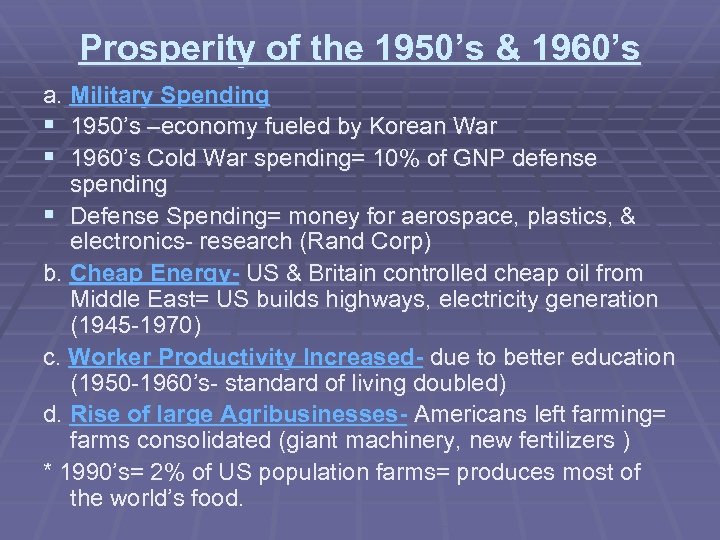 Prosperity of the 1950’s & 1960’s a. Military Spending § 1950’s –economy fueled by Korean War § 1960’s Cold War spending= 10% of GNP defense spending § Defense Spending= money for aerospace, plastics, & electronics- research (Rand Corp) b. Cheap Energy- US & Britain controlled cheap oil from Middle East= US builds highways, electricity generation (1945 -1970) c. Worker Productivity Increased- due to better education (1950 -1960’s- standard of living doubled) d. Rise of large Agribusinesses- Americans left farming= farms consolidated (giant machinery, new fertilizers ) * 1990’s= 2% of US population farms= produces most of the world’s food.