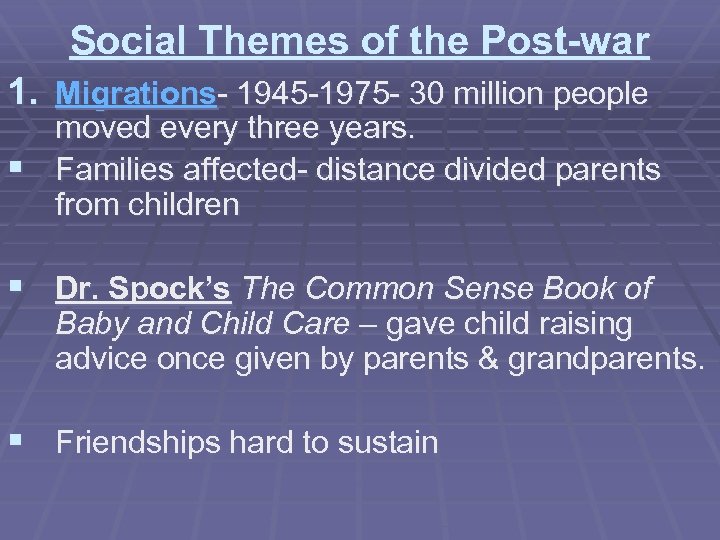 Social Themes of the Post-war 1. Migrations- 1945 -1975 - 30 million people moved every three years. § Families affected- distance divided parents from children § Dr. Spock’s The Common Sense Book of Baby and Child Care – gave child raising advice once given by parents & grandparents. § Friendships hard to sustain