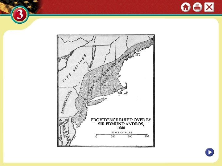 1 Tensions Emerge Crackdown in Massachusetts • Some colonists resent Navigation Acts; still smuggle goods abroad • In 1684 King Charles revokes corporate charter; creates royal colony; “Puritan utopia” is over The Dominion of New England • In 1685, King James creates Dominion of New England - land from southern ME to NJ united into one colony; to make colony more obedient, Dominion placed under single ruler - The King wanted to assert more control over the independent assemblies and enforce economic restrictions. • Governor Sir Edmund Andros antagonizes Puritans, merchants - Harshly enforces Navigation Acts - Questions lawfulness of Puritan religion - Outlaws local assemblies; levies taxes without consent NEXT