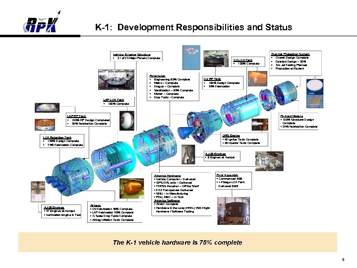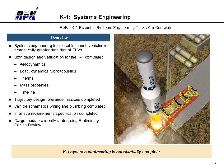 K-1: Systems Engineering Rp. K’s K-1 Essential Systems Engineering Tasks Are Complete Overview n Systems engineering for reusable launch vehicles is dramatically greater than that of ELVs n Both design and verification for the K-1 completed – Aerodynamics – Load, dynamics, vibroacoustics – Thermal – Mass properties – Timeline n Trajectory design reference missions completed n Vehicle schematics wiring and plumbing completed n Interface requirements specification completed n Cargo module currently undergoing Preliminary Design Review K-1 systems engineering is substantially complete 8