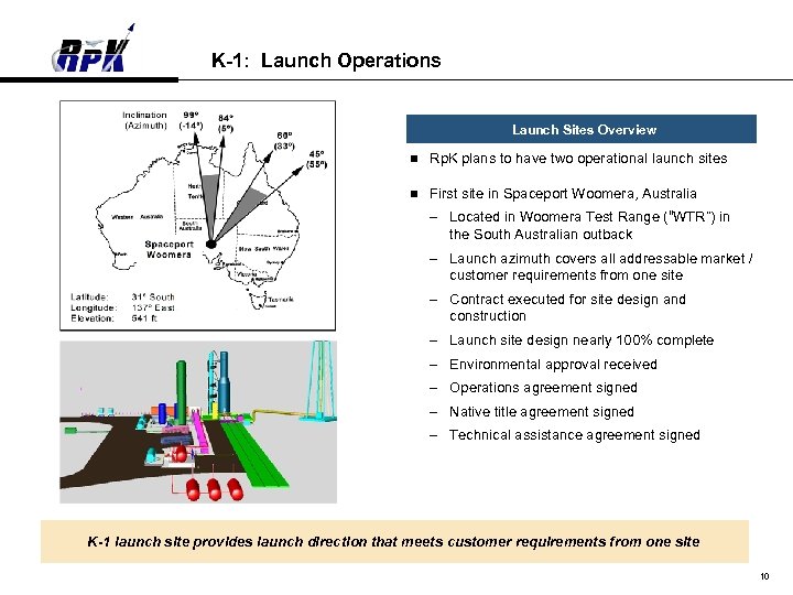 K-1: Development Responsibilities and Status Vehicle Exterior Structure • 21 of 23 Major Panels Complete LAP LOX Tank • 100% Complete Parachutes • Engineering 90% Complete • Mains – Complete • Drogue – Complete • Stabilization – 95% Complete • Mortar – Complete • Drop Tests - Complete OV LOX Tank • 100% Complete Thermal Protection System • Overall Design Complete • Detailed Design – 30% • Arc Jet Testing Planned • Production at Restart OV RP Tank • 100% Design Complete • 35% Fabrication Payload Module • 100% Structural Design Complete • 25% Fabrication Complete LAP RP Tank • 100% RP Design Completed • 30% Fabrication Complete OMS Engine • 40 Igniter Tests Complete • 29 Injector Tests Complete LOX Retention Tank • 100% Design Complete • 75% Fabrication Complete AJ-26 Engines • 9 Engines at Aerojet AJ-26 Engines • 37 Engines at Aerojet • Verification Engine in Test Airbags • OV Fabrication 50% Complete • LAP Fabrication 50% Complete • ¼ Scale Drop Tests Complete • Airbag Inflation Tests Complete Avionics Hardware • Vehicle Computer – Delivered • GPS /INS units – Delivered • TDRSS Receiver – Off the Shelf • FAA Transponder Delivered • SMU – In Manufacturing • PDU, MEC – In Test Avionics Software • GN&C Complete • Hardware in the Loop (HWIL) With Flight Hardware / Software Testing Final Assembly • Commenced 5/98 • 1 st Stage LOX Tank Delivered 6/98 Launch Site • First Site in Australia • Contract Executed for Site Design and Construction • Launch Site Design 100% complete • Environmental Approval Received • Launch Operation Contract Signed • Native Title Agreement Signed • Site Ground Breaking • Export License Approved • Second Site Planned in U. S. The K-1 vehicle hardware is 75% complete 9