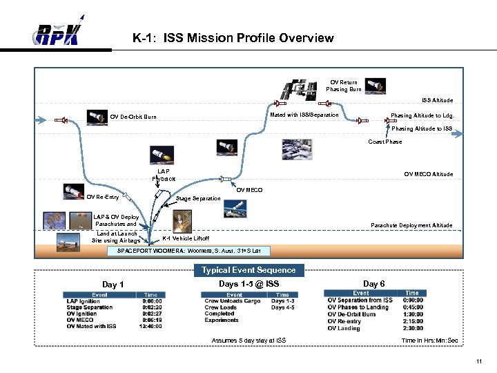 K-1: ISS Mission Profile Overview OV Return Phasing Burn ISS Altitude Mated with ISS/Separation OV De-Orbit Burn Phasing Altitude to Ldg. Phasing Altitude to ISS Coast Phase LAP Flyback OV MECO Altitude OV MECO OV Re-Entry Stage Separation LAP & OV Deploy Parachutes and Land at Launch Site using Airbags Parachute Deployment Altitude K-1 Vehicle Liftoff SPACEPORT WOOMERA: Woomera, S. Aust. 31 o S Lat Typical Event Sequence Day 1 Days 1 -5 @ ISS Assumes 5 day stay at ISS Day 6 Time in Hrs: Min: Sec 11