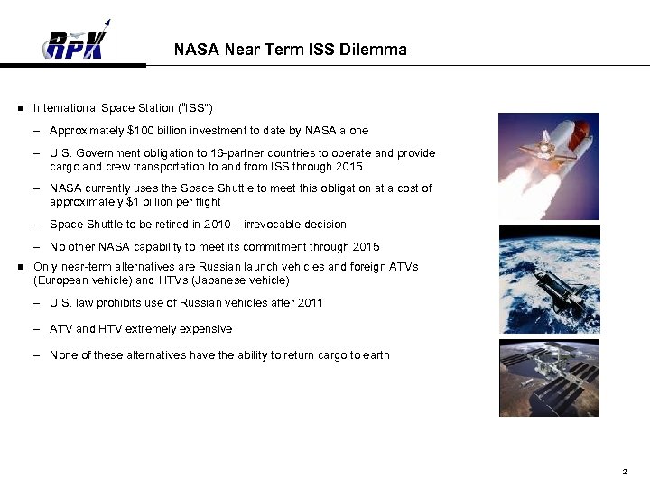 NASA Near Term ISS Dilemma n International Space Station (“ISS”) – Approximately $100 billion investment to date by NASA alone – U. S. Government obligation to 16 -partner countries to operate and provide cargo and crew transportation to and from ISS through 2015 – NASA currently uses the Space Shuttle to meet this obligation at a cost of approximately $1 billion per flight – Space Shuttle to be retired in 2010 – irrevocable decision – No other NASA capability to meet its commitment through 2015 n Only near-term alternatives are Russian launch vehicles and foreign ATVs (European vehicle) and HTVs (Japanese vehicle) – U. S. law prohibits use of Russian vehicles after 2011 – ATV and HTV extremely expensive – None of these alternatives have the ability to return cargo to earth 2
