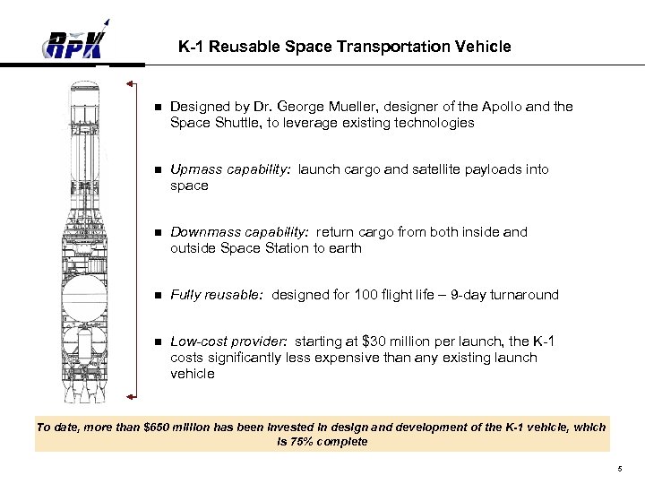 NASA COTS Program Overview NASA COTS Program n Two grant recipients, Rp. K and Space. X, out of 20 competitors n Rp. K strengths identified by NASA include: – Strong management team – Design and technical maturity of the K-1 – Multiple market approach of the Company’s business plan n Space Act Agreement signed August 18, 2006 provides $207 million to Rp. K through 2009 – Rp. K retains nearly all intellectual property and commercial rights to technology (commercial program in which NASA does not end up owning the launch vehicle) – NASA provides important resources and technical expertise to the K-1 Program – NASA will be the Company’s largest customer – COTS Program is critically important to NASA and its goals n Rp. K has successfully completed all NASA milestones to date and has received $32. 1 million in milestone payments l n Latest Milestone: System Requirements Review Ø Met ahead of schedule and under budget Successful completion of the NASA COTS Program will position Rp. K to win a commercial contract for ISS re-supply – a $1 billion annual opportunity 4