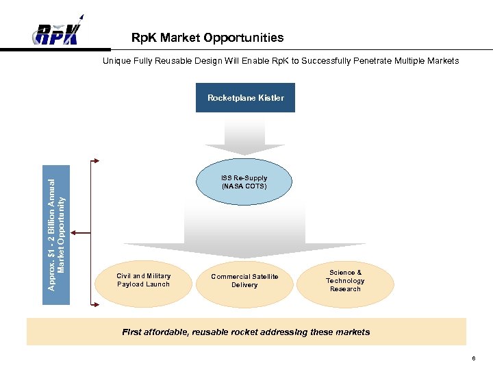 K-1 Reusable Space Transportation Vehicle n Designed by Dr. George Mueller, designer of the Apollo and the Space Shuttle, to leverage existing technologies n Upmass capability: launch cargo and satellite payloads into space n Downmass capability: return cargo from both inside and outside Space Station to earth n Fully reusable: designed for 100 flight life – 9 -day turnaround n Low-cost provider: starting at $30 million per launch, the K-1 costs significantly less expensive than any existing launch vehicle To date, more than $650 million has been invested in design and development of the K-1 vehicle, which is 75% complete 5