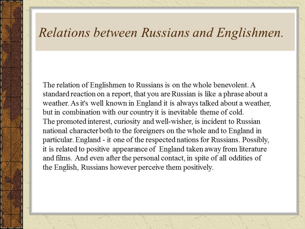 Relations between Russians and Englishmen. The relation of Englishmen to Russians is on the whole benevolent. A standard reaction on a report, that you are Russian is like a phrase about a weather. As it's well known in England it is always talked about a weather, but in combination with our country it is inevitable theme of cold. The promoted interest, curiosity and well-wisher, is incident to Russian national character both to the foreigners on the whole and to England in particular. England - it one of the respected nations for Russians. Possibly, it is related to positive appearance of England taken away from literature and films. And even after the personal contact, in spite of all oddities of the English, Russians however perceive them positively.
