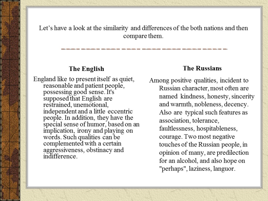 Let’s have a look at the similarity and differences of the both nations and then compare them. The English England like to present itself as quiet, reasonable and patient people, possessing good sense. It's supposed that English are restrained, unemotional, independent and a little eccentric people. In addition, they have the special sense of humor, based on an implication, irony and playing on words. Such qualities can be complemented with a certain aggressiveness, obstinacy and indifference. The Russians Among positive qualities, incident to Russian character, most often are named kindness, honesty, sincerity and warmth, nobleness, decency. Also are typical such features as association, tolerance, faultlessness, hospitableness, courage. Two most negative touches of the Russian people, in opinion of many, are predilection for an alcohol, and also hope on "perhaps", laziness, languor.