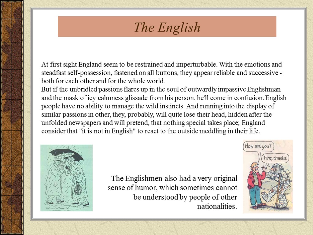 At first sight England seem to be restrained and imperturbable. With the emotions and steadfast self-possession, fastened on all buttons, they appear reliable and successive - both for each other and for the whole world. But if the unbridled passions flares up in the soul of outwardly impassive Englishman and the mask of icy calmness glissade from his person, he'll come in confusion. English people have no ability to manage the wild instincts. And running into the display of similar passions in other, they, probably, will quite lose their head, hidden after the unfolded newspapers and will pretend, that nothing special takes place; England consider that "it is not in English" to react to the outside meddling in their life. The English The Englishmen also had a very original sense of humor, which sometimes cannot be understood by people of other nationalities.