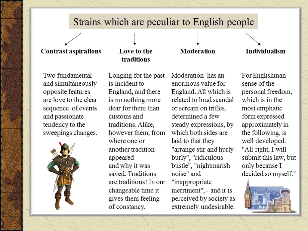 Strains which are peculiar to English people Contrast aspirations Love to the traditions Moderation Individualism Two fundamental and simultaneously opposite features are love to the clear sequence of events and passionate tendency to the sweepings changes. Longing for the past is incident to England, and there is no nothing more dear for them than customs and traditions. Alike, however them, from where one or another tradition appeared and why it was saved. Traditions are traditions! In our changeable time it gives them feeling of constancy. Moderation has an enormous value for England. All which is related to loud scandal or scream on trifles, determined a few steady expressions, by which both sides are laid to that they "arrange stir and hurly-burly", "ridiculous bustle", "nightmarish noise" and "inappropriate merriment", - and it is perceived by society as extremely undesirable. For Englishman sense of the personal freedom, which is in the most emphatic form expressed approximately in the following, is well developed: "All right, I will submit this law, but only because I decided so myself."