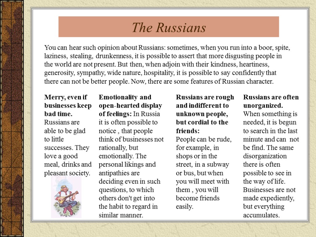 You can hear such opinion about Russians: sometimes, when you run into a boor, spite, laziness, stealing, drunkenness, it is possible to assert that more disgusting people in the world are not present. But then, when adjoin with their kindness, heartiness, generosity, sympathy, wide nature, hospitality, it is possible to say confidently that there can not be better people. Now, there are some features of Russian character. Merry, even if businesses keep bad time. Russians are able to be glad to little successes. They love a good meal, drinks and pleasant society. Emotionality and open-hearted display of feelings: In Russia it is often possible to notice , that people think of businesses not rationally, but emotionally. The personal likings and antipathies are deciding even in such questions, to which others don't get into the habit to regard in similar manner. Russians are rough and indifferent to unknown people, but cordial to the friends: People can be rude, for example, in shops or in the street, in a subway or bus, but when you will meet with them , you will become friends easily. The Russians Russians are often unorganized. When something is needed, it is begun to search in the last minute and can not be find. The same disorganization there is often possible to see in the way of life. Businesses are not made expediently, but everything accumulates.