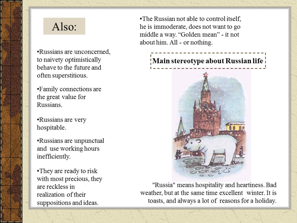 Also: Russians are unconcerned, to naivety optimistically behave to the future and often superstitious. Family connections are the great value for Russians. Russians are very hospitable. Russians are unpunctual and use working hours inefficiently. They are ready to risk with most precious, they are reckless in realization of their suppositions and ideas. The Russian not able to control itself, he is immoderate, does not want to go middle a way. “Golden mean” - it not about him. All - or nothing. "Russia" means hospitality and heartiness. Bad weather, but at the same time excellent winter. It is toasts, and always a lot of reasons for a holiday. Main stereotype about Russian life