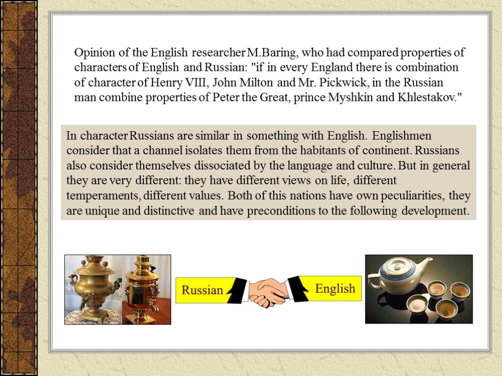 In character Russians are similar in something with English. Englishmen consider that a channel isolates them from the habitants of continent. Russians also consider themselves dissociated by the language and culture. But in general they are very different: they have different views on life, different temperaments, different values. Both of this nations have own peculiarities, they are unique and distinctive and have preconditions to the following development. Opinion of the English researcher M.Baring, who had compared properties of characters of English and Russian: "if in every England there is combination of character of Henry VIII, John Milton and Mr. Pickwick, in the Russian man combine properties of Peter the Great, prince Myshkin and Khlestakov."