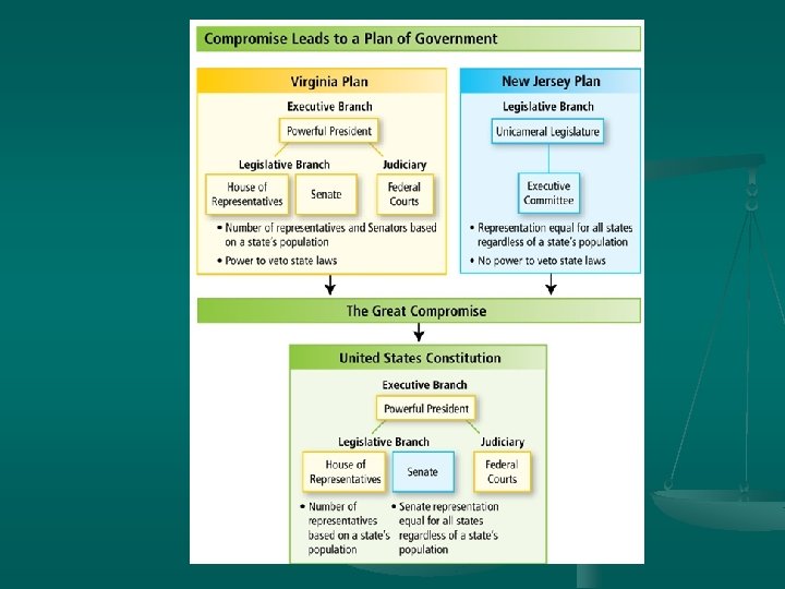 Areas of Agreement n n Scrap Articles of Confederation- draw up new basic law New gov’t should still be republican in form, with a chief executive to be elected by people or representatives (checks/balances) Gov’t based on majority (popular sovereignty), but still protect the rights of the minority Need a strong centralized gov’t that had the power to tax, regulate interstate trade/foreign commerce