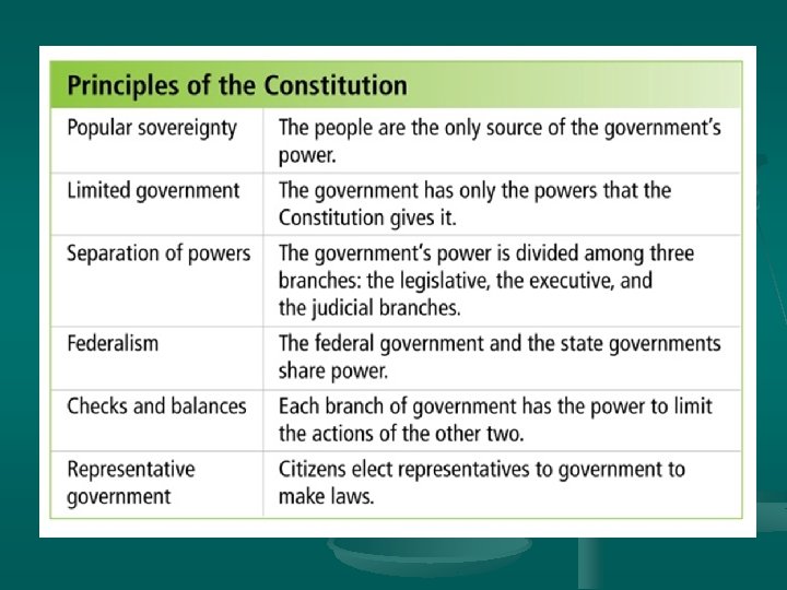 Principles of the U. S. Constitution • • Federal law superior to state law Constitution is the supreme law of the land Constitution a living document- can change with the times Under Articles power in the hands of states, under Constitution power in hands of the people (popular sovereignty)