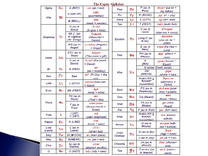 Coptic Alphabet song! Alpha, veta, gamma, delta Ee, so, zeeta, eeta// Theta, iota, kappa, lola, Mei, nei, eksee, oo// Pi, ro, seema, tav Epsilon, fei, kei, epsi// Ou, shai, fai, khai, hori, Jenja, cheema, tee 32 letters!