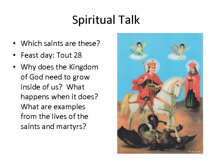 Spiritual Talk • Which saints are these? • Feast day: Tout 28 • Why does the Kingdom of God need to grow inside of us? What happens when it does? What are examples from the lives of the saints and martyrs?