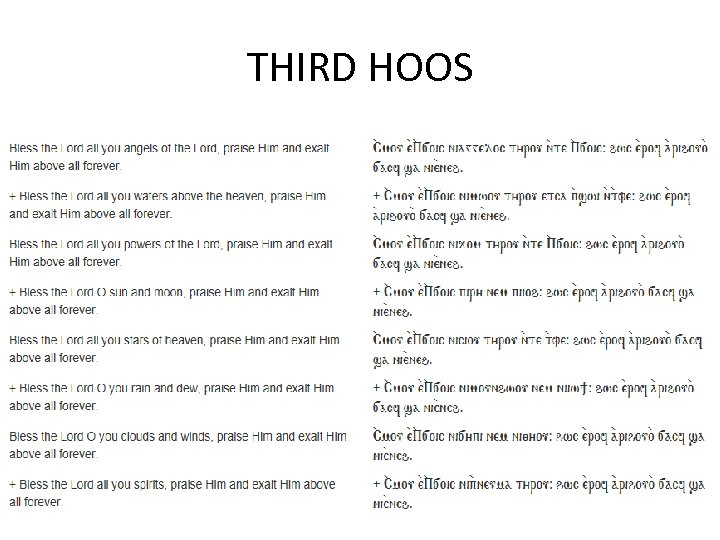 Transliteration of Third Hoos Esmo Epshois, ni-angelos tiro ente Epshois, hos erof ari-ho-oo chasf sha ni-eneh. Esmo Epshois, no-mo-ou tiro etsa epshoi enetfe, hos erof ari-ho-oo chasf sha ni-eneh. Esmo Epshois, nigom tiro ente Epshois, hos erof ari-ho-oo chasf sha ni-eneh. Esmo Epshois, piri nem peyoh, hos erof ari-ho-oo chasf sha ni-eneh. Esmo Epshois, ni-seyo tiro ente etfe, hos erof ari-ho-oo chasf sha ni-eneh. Esmo Epshois, ni-mon-ho-ou nem nieyoti, hos erof ari-ho-oo chasf sha ni-eneh. Esmo Epshois, ni-et-shipi nem ni-thio, hos erof ari-ho-oo chasf sha ni-eneh. Esmo Epshois, ni-epnevma tiro, hos erof ari-ho-oo chasf sha ni-eneh. Esmo Epshois, pi-ekrom nem pi-qavma, hos erof ari-ho-oo chasf sha ni-eneh