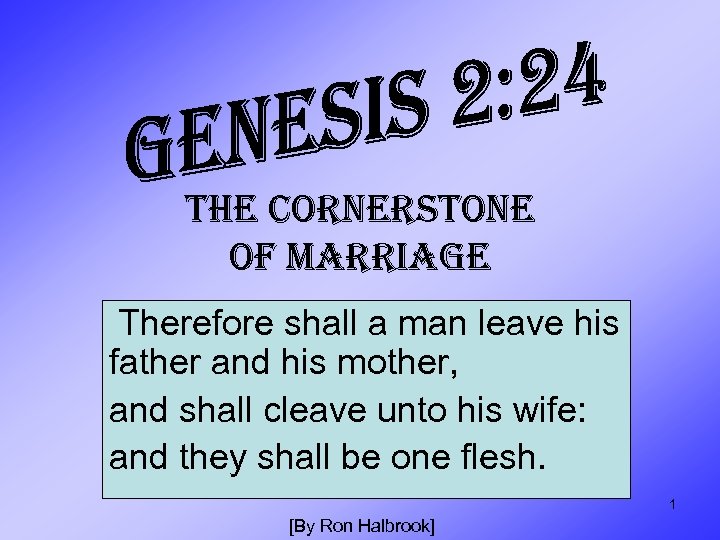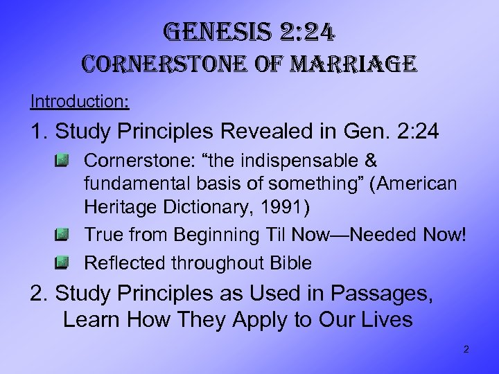 GENESIS 2: 24 CORNERSTONE OF MARRIAGE Introduction: 1. Study Principles Revealed in Gen. 2: 24 Cornerstone: “the indispensable & fundamental basis of something” (American Heritage Dictionary, 1991) True from Beginning Til Now—Needed Now! Reflected throughout Bible 2. Study Principles as Used in Passages, Learn How They Apply to Our Lives 2