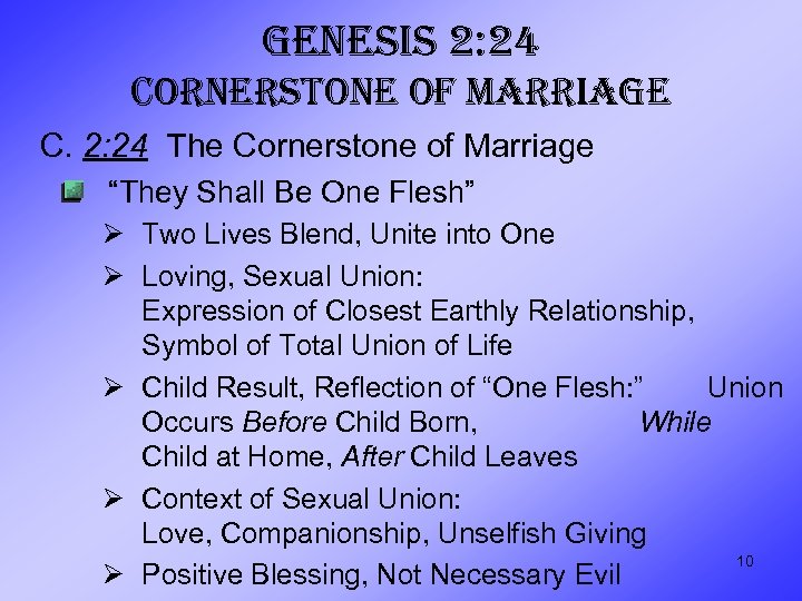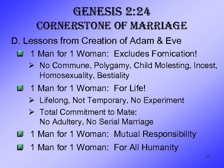 GENESIS 2: 24 CORNERSTONE OF MARRIAGE C. 2: 24 The Cornerstone of Marriage “They Shall Be One Flesh” Ø Two Lives Blend, Unite into One Ø Loving, Sexual Union: Expression of Closest Earthly Relationship, Symbol of Total Union of Life Ø Child Result, Reflection of “One Flesh: ” Union Occurs Before Child Born, While Child at Home, After Child Leaves Ø Context of Sexual Union: Love, Companionship, Unselfish Giving 10 Ø Positive Blessing, Not Necessary Evil