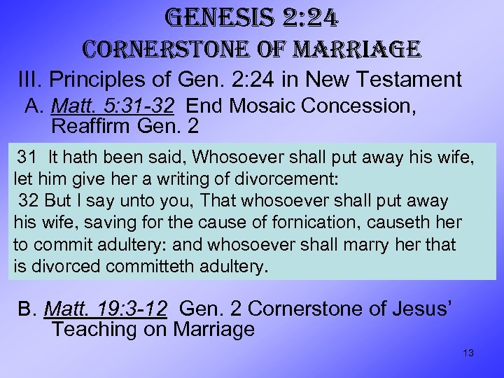 GENESIS 2: 24 CORNERSTONE OF MARRIAGE II. Principles of Gen. 2: 24 in Old Testament A. Ex. 20: 14, 17; Deut. 22: 22 Reinforce Gen. 2 by Condemning Adultery B. Deut. 24: 1 -4 Limited, Temporary Concession to Lead Man Back to Gen. 2 C. Jer. 3: 1, 8, 14; 29: 10 God’s Relationship with Israel Reflects Gen. 2 D. Many Admonitions Reinforce Gen. 2 Prov. 5: 15 -21 Drink from Your Own Well Mal. 2: 14 -16 God Hates Divorce 12
