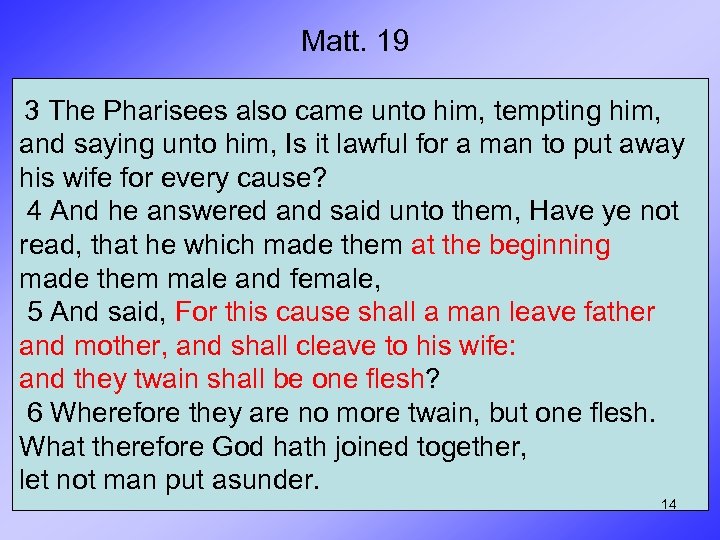 Matt. 19 3 The Pharisees also came unto him, tempting him, and saying unto him, Is it lawful for a man to put away his wife for every cause? 4 And he answered and said unto them, Have ye not read, that he which made them at the beginning made them male and female, 5 And said, For this cause shall a man leave father and mother, and shall cleave to his wife: and they twain shall be one flesh? 6 Wherefore they are no more twain, but one flesh. What therefore God hath joined together, let not man put asunder. 14