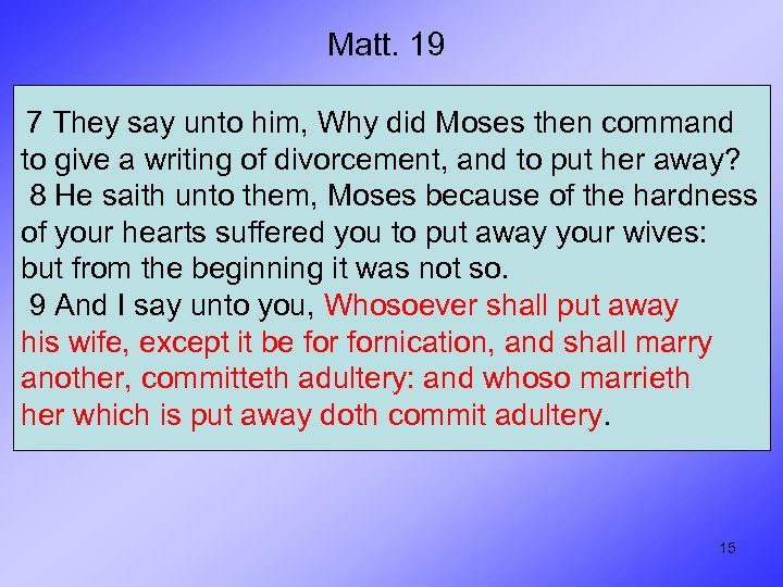 Matt. 19 7 They say unto him, Why did Moses then command to give a writing of divorcement, and to put her away? 8 He saith unto them, Moses because of the hardness of your hearts suffered you to put away your wives: but from the beginning it was not so. 9 And I say unto you, Whosoever shall put away his wife, except it be fornication, and shall marry another, committeth adultery: and whoso marrieth her which is put away doth commit adultery. 15