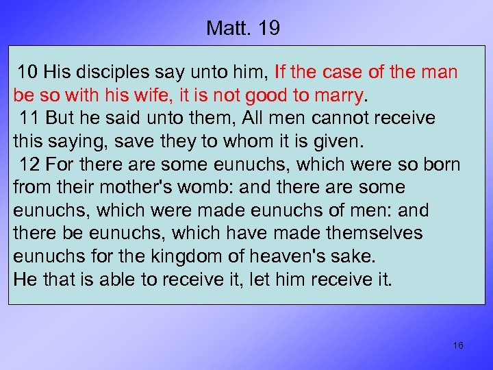 Matt. 19 10 His disciples say unto him, If the case of the man be so with his wife, it is not good to marry. 11 But he said unto them, All men cannot receive this saying, save they to whom it is given. 12 For there are some eunuchs, which were so born from their mother's womb: and there are some eunuchs, which were made eunuchs of men: and there be eunuchs, which have made themselves eunuchs for the kingdom of heaven's sake. He that is able to receive it, let him receive it. 16