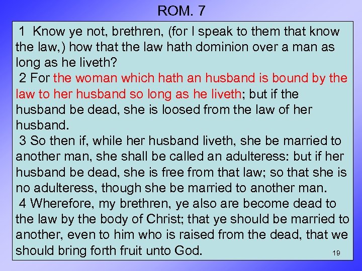 ROM. 7 1 Know ye not, brethren, (for I speak to them that know the law, ) how that the law hath dominion over a man as long as he liveth? 2 For the woman which hath an husband is bound by the law to her husband so long as he liveth; but if the husband be dead, she is loosed from the law of her husband. 3 So then if, while her husband liveth, she be married to another man, she shall be called an adulteress: but if her husband be dead, she is free from that law; so that she is no adulteress, though she be married to another man. 4 Wherefore, my brethren, ye also are become dead to the law by the body of Christ; that ye should be married to another, even to him who is raised from the dead, that we should bring forth fruit unto God. 19
