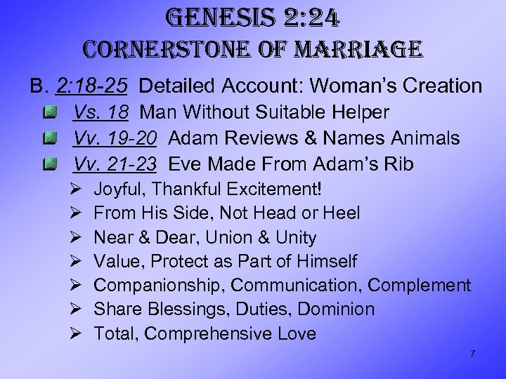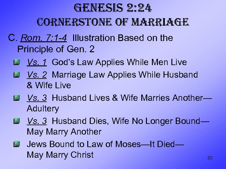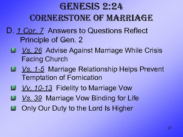 GENESIS 2: 24 CORNERSTONE OF MARRIAGE D. 1 Cor. 7 Answers to Questions Reflect Principle of Gen. 2 Vs. 26 Advise Against Marriage While Crisis Facing Church Vs. 1 -5 Marriage Relationship Helps Prevent Temptation of Fornication Vv. 10 -13 Fidelity to Marriage Vow Vs. 39 Marriage Vow Binding for Life Only Our Duty to the Lord Is Higher 21