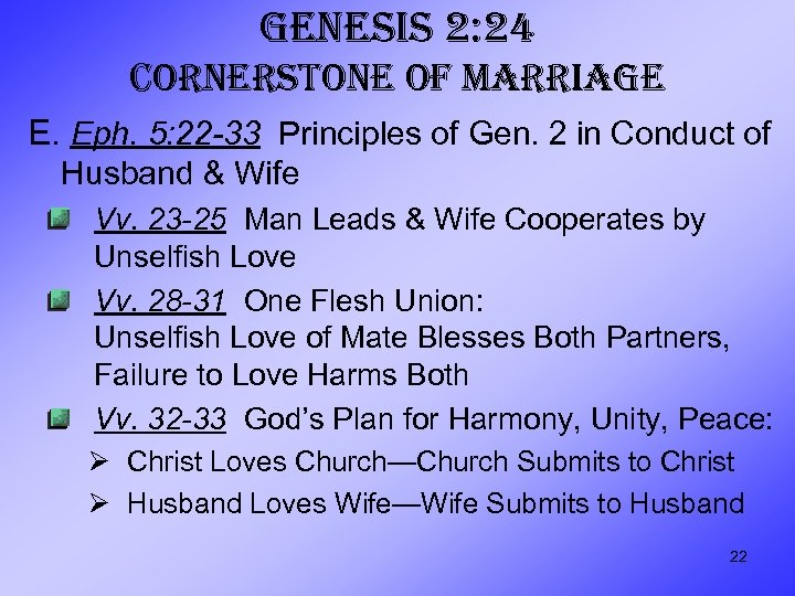 GENESIS 2: 24 CORNERSTONE OF MARRIAGE E. Eph. 5: 22 -33 Principles of Gen. 2 in Conduct of Husband & Wife Vv. 23 -25 Man Leads & Wife Cooperates by Unselfish Love Vv. 28 -31 One Flesh Union: Unselfish Love of Mate Blesses Both Partners, Failure to Love Harms Both Vv. 32 -33 God’s Plan for Harmony, Unity, Peace: Ø Christ Loves Church—Church Submits to Christ Ø Husband Loves Wife—Wife Submits to Husband 22