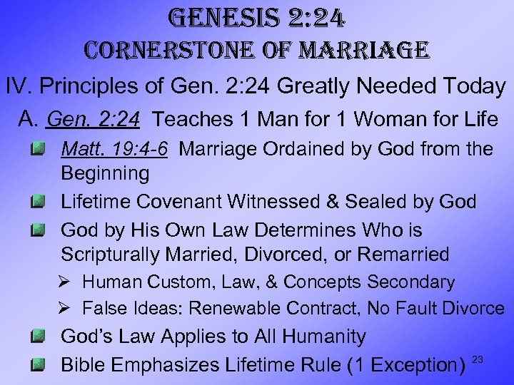 GENESIS 2: 24 CORNERSTONE OF MARRIAGE IV. Principles of Gen. 2: 24 Greatly Needed Today A. Gen. 2: 24 Teaches 1 Man for 1 Woman for Life Matt. 19: 4 -6 Marriage Ordained by God from the Beginning Lifetime Covenant Witnessed & Sealed by God by His Own Law Determines Who is Scripturally Married, Divorced, or Remarried Ø Human Custom, Law, & Concepts Secondary Ø False Ideas: Renewable Contract, No Fault Divorce God’s Law Applies to All Humanity Bible Emphasizes Lifetime Rule (1 Exception) 23
