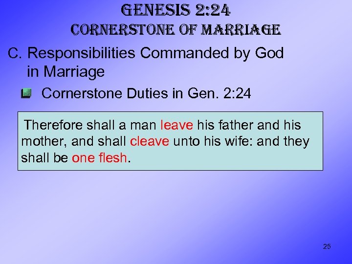 GENESIS 2: 24 CORNERSTONE OF MARRIAGE C. Responsibilities Commanded by God in Marriage Cornerstone Duties in Gen. 2: 24 Therefore shall a man leave his father and his mother, and shall cleave unto his wife: and they shall be one flesh. 25
